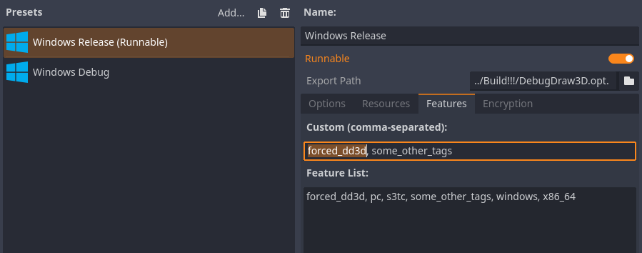 However if you need to use debug rendering in the release version, then you can add the forced_dd3d feature when exporting. In this case, the release library with all the functionality will be used.